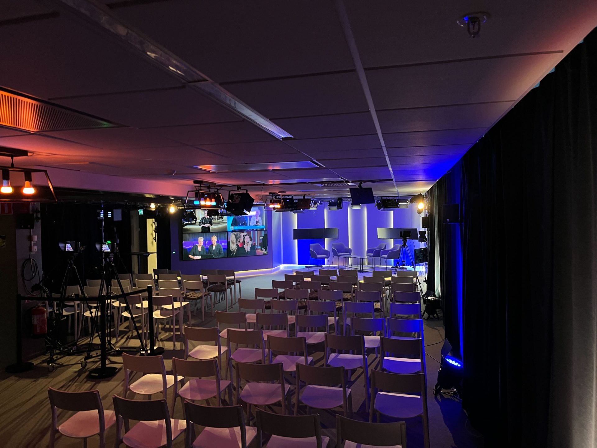Studio för Livesändningar  Hybridsändningar Bolagsstämmor Inspelningar LiveSeminarier  Onlineutbildningar upp till 110 personer i publiken Livesända galor Investor relations