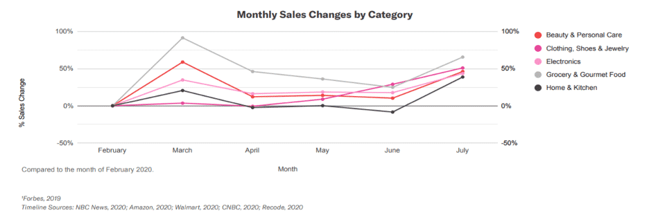 Med tomma fysiska butikshyllor och konsumenter som undviker personliga interaktioner, så påskyndade COVID-19 konsumenternas antagande av online-shopping. Detta gäller särskilt på e-marknadsplatser såsom Amazon och Walmart, där online-shoppare flockades för att inhandla essentiella varor som desinfektionsmedel, livsmedel och elektronik etc för att stå beredda inför de konsekvenser som pandemin kom kunna leda till – som socialt distansera och arbete hemifrån.